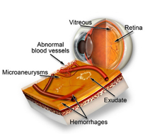 ‧增殖性糖尿病視網膜病變: 晚期的糖尿病視網膜病變。視網膜血液供應受損,觸發新血管生長,這些血管非常脆弱和容易出血,會損害視力,導致失明。這些新生血管亦帶有纖維細胞,可能令視網膜纖維化,導致玻璃狀體出血,引起繼發性視網膜脫落或繼發性青光眼病。